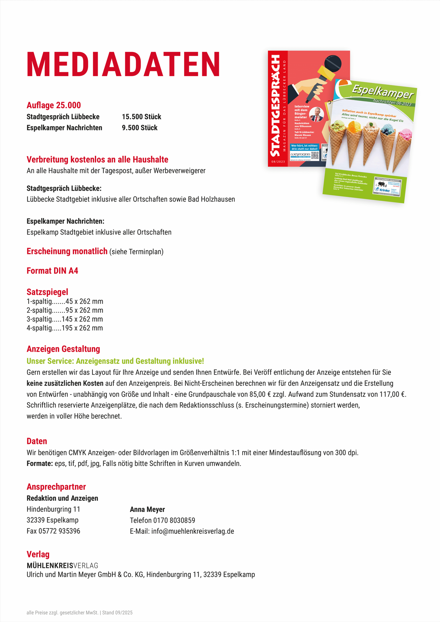 Die Mediadaten enthalten Informationen über unsere Magazine, die Ihnen helfen, die richtige Werbeplatzierung oder Anzeigengröße zu wählen. Sie beinhalten Angaben zur Auflage, Verteilung, Preise und Vorgaben bei Druckdaten-Lieferung.